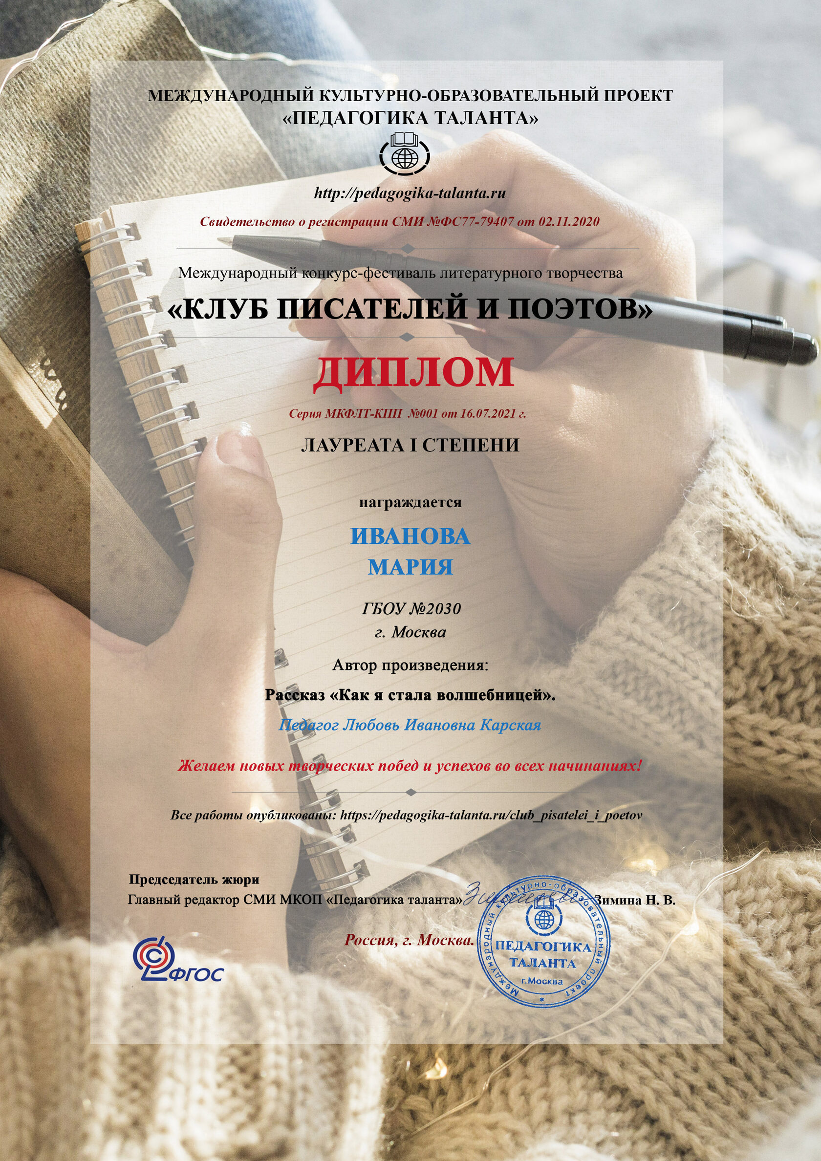 Диплом участнику + Благодарственное письмо педагогу.