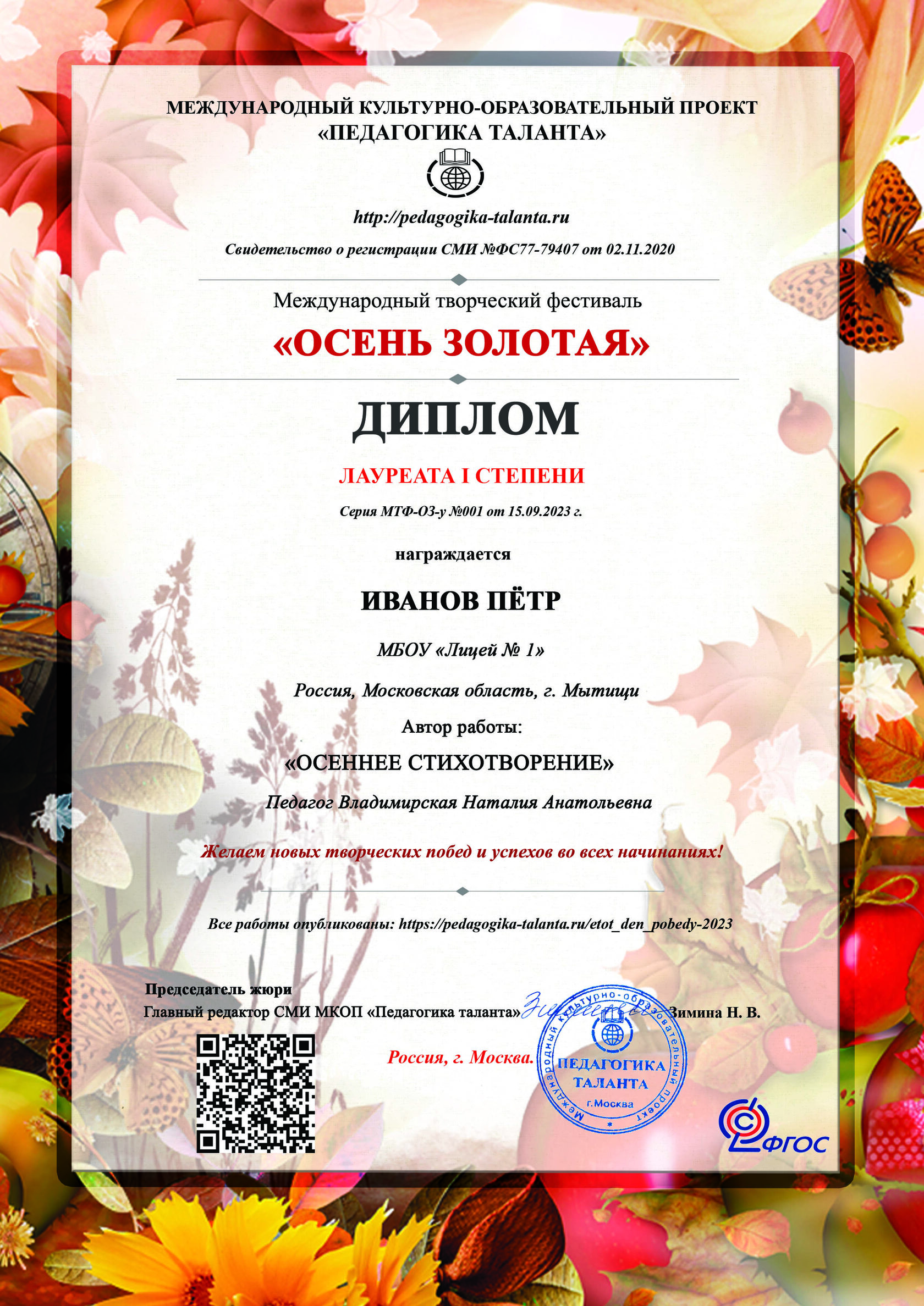 В отличие от многочисленных компаний, предлагающих услуги по мгновенному выпуску свидетельств, дипломов и сертификатов, мы действительно проводим те мероприятия, которые заявляем. Мы публикуем все конкурсные работы и статьи.