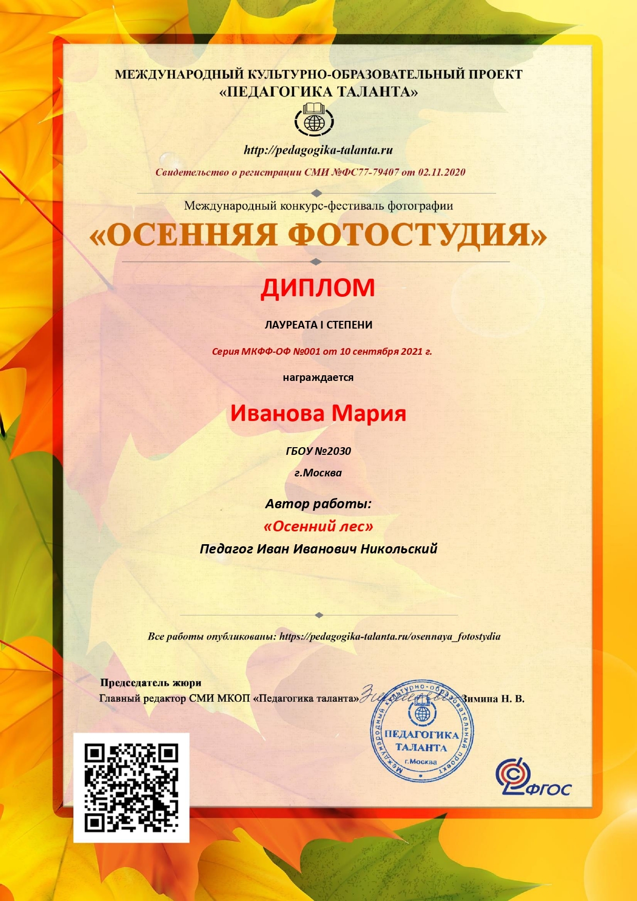 Диплом участнику + Благодарственное письмо педагогу.