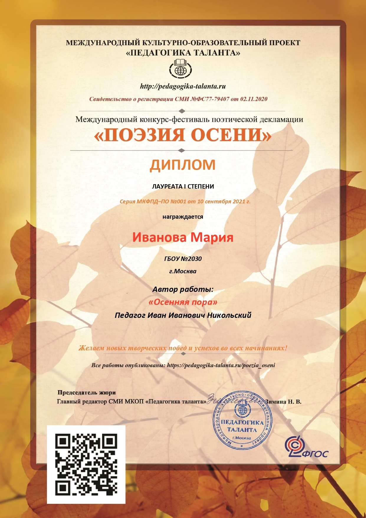 Диплом участнику + Благодарственное письмо педагогу.
