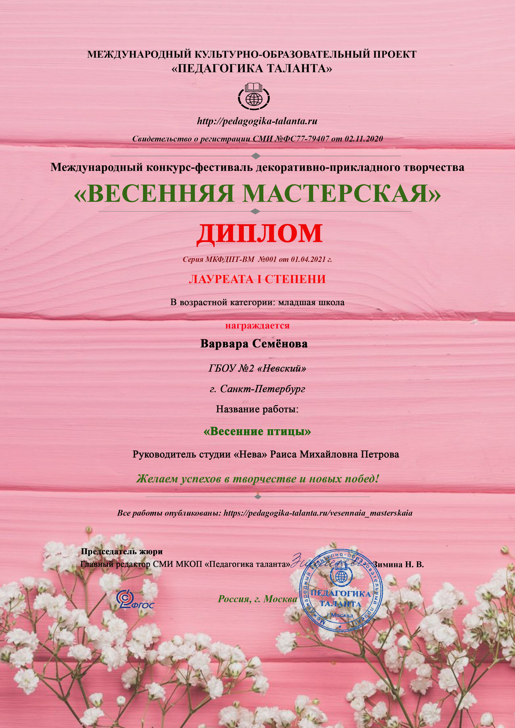 Диплом автору + Благодарственное письмо педагогу + Благодарственное письмо родителям.